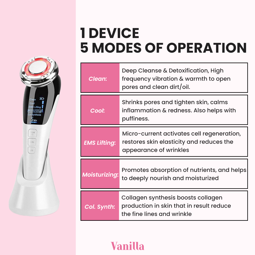 Elevate your skincare routine with this 5-in-1 device that combines targeted treatment modes with red and blue light therapy.