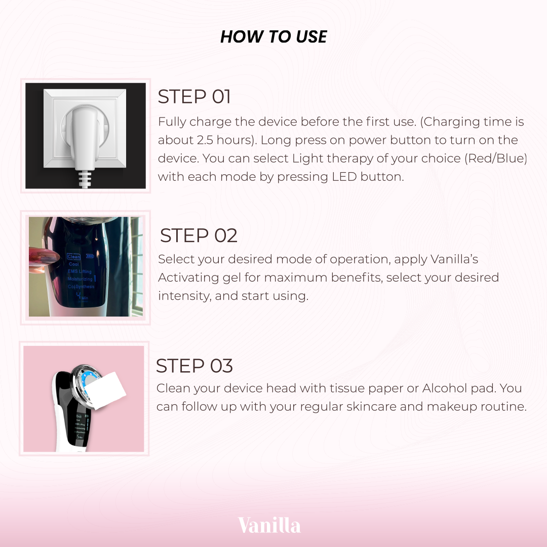 Apply your favorite gel or serum. For best results, use Vanilla's Activating Gel or Collagen Jelly Moisturizer for a smoother glide and enhanced effectiveness.