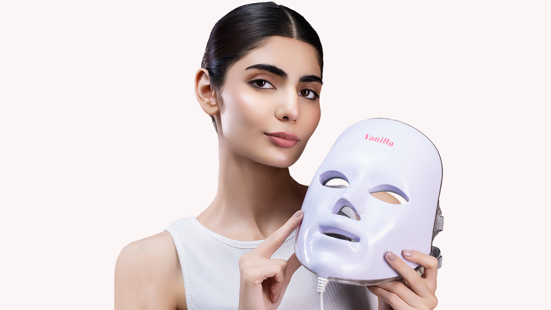 Vanilla’s Radiant Glo LED face mask, an innovative wearable light therapy device offering a non-invasive LED cosmetic treatment crafted to stimulate skin rejuvenation and diminish the visibility of pigmentation, wrinkles, and acne.