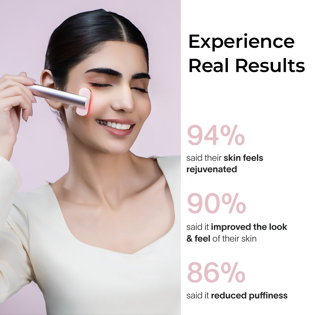 The wand warms up slightly during use to support blood flow and ease facial tension. This warmth helps reduce puffiness, especially around the eyes, while giving your skin a relaxed and refreshed appearance.