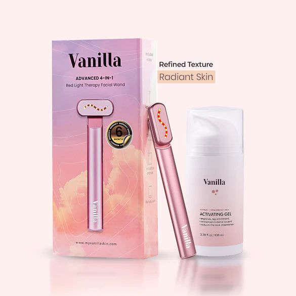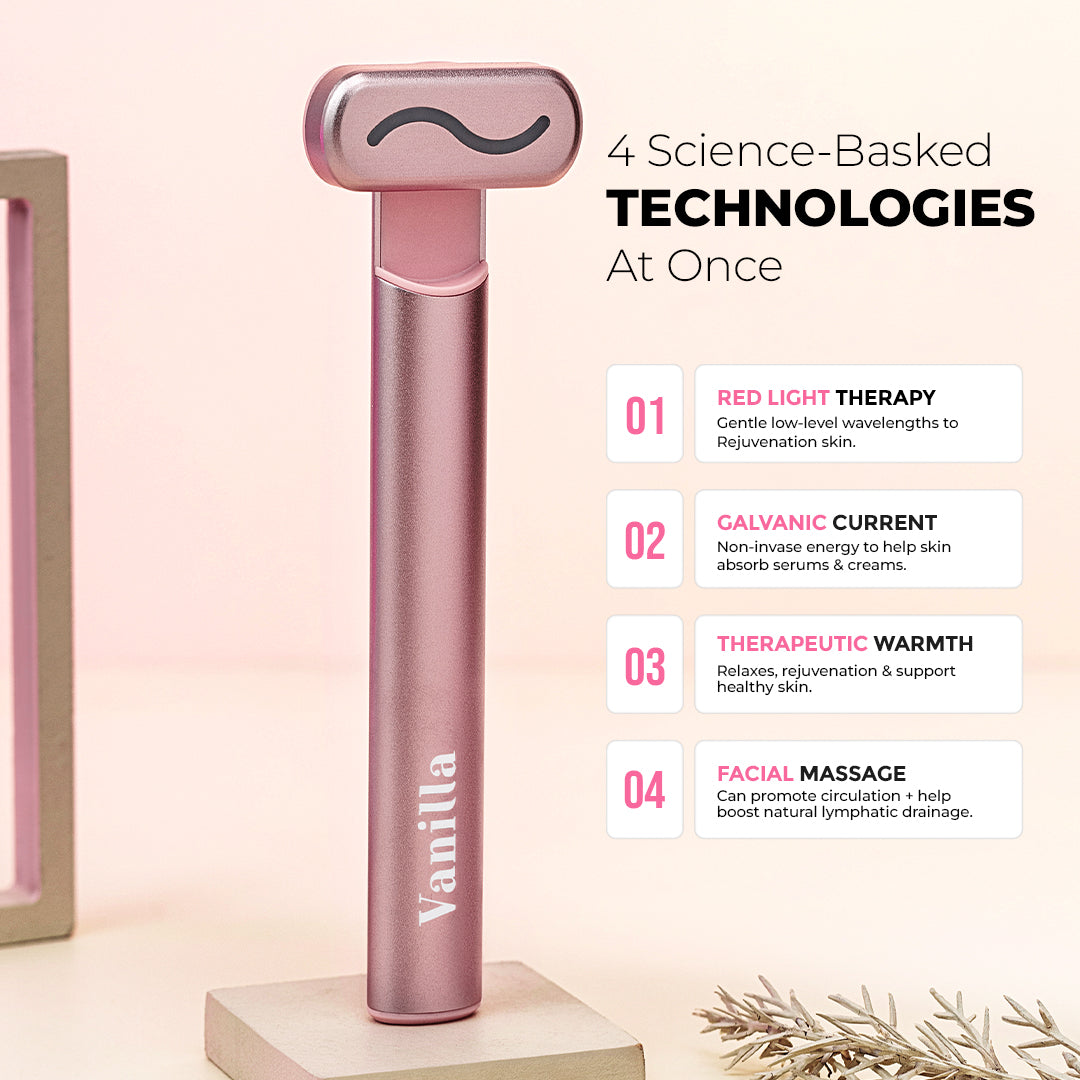 Experience the ultimate at-home skincare treatment with Vanilla’s Red Light Therapy Facial Wand. This multi-functional device combines Red Light Therapy, Galvanic Current, Facial Massage, and Therapeutic Warmth—all working together to visibly reduce signs of aging, diminish fine lines and wrinkles, and revive your skin’s natural glow.